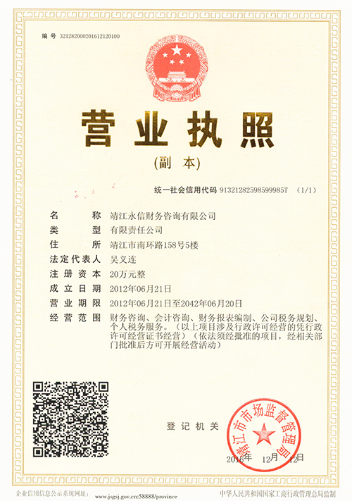 靖江永信財務(wù)咨詢有限公司是依法注冊成立的專業(yè)財稅代理機構(gòu)。公司主要業(yè)務(wù)為:代辦公司營業(yè)執(zhí)照、注冊各類公司、代理記賬報稅,代理商標注冊,工商年檢,稅務(wù)登記年檢,企業(yè)清理注銷等,注冊香港公司,代辦申請一般納稅人資格認定,公司專業(yè)為中小企業(yè)進行納稅籌劃,代理記賬報稅,企業(yè)內(nèi)部審計;同時也專業(yè)代理進出口經(jīng)營權(quán)申請。